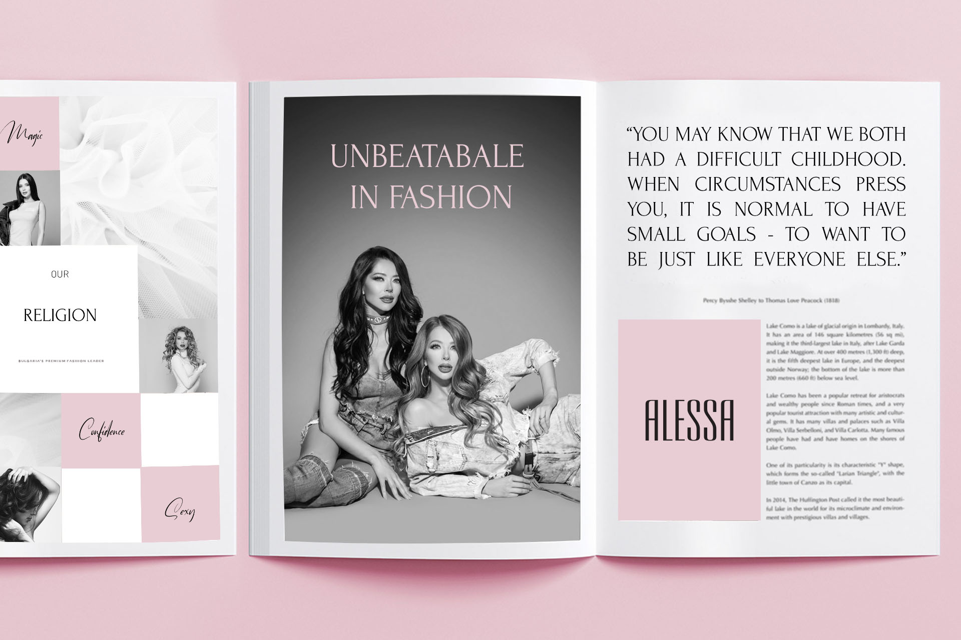 We created the Alessa font for the 10th anniversary of the brand. It is a rounded serif typeface with capital letters in the regular style. The letters give the impression of luxury and being part of the high-quality fashion industry. For the best user experience in different countries, the font supports the Bulgarian and English alphabets.